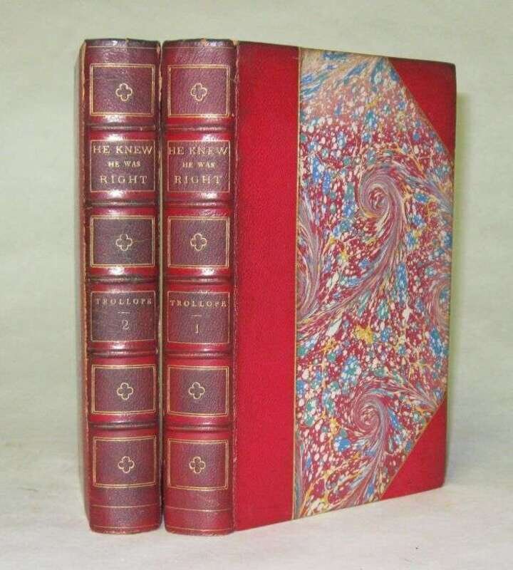 Trollope, Anthony. He Knew He Was Right. London: Strahan, 1869. First English book form edition. 8vo, contemp. 3/4 scarlet morocco & marbled bds., gilt, t.e.g., other edges rough cut; spines darkened, occasionally scuffed, joints & spine ends occasionally rubbed. Complete with 1/2 titles. With 64 illus. by Marcus Stone. Very occasional, very minor foxing.