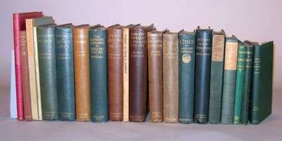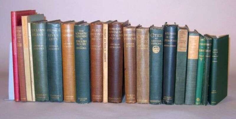Symons, Arthur - Criticism, Travel & C: An Introduction to The Study of Browning. London, etc.: Cassell, 1886. 1st ed., 1st issue. Sm. 8vo, orig. green cloth, gilt-lettered spine; light edge wear. With 16 pp. pub. cat. dated 10, 86. Bookplate on front paste-down. Author's first book. Beckson A1a. * Another copy of the 1st issue of the preceding, orig. green cloth; scuffed, with 16 pp. pub. cat. dated, 10, 86. * A later 1886 issue of the preceding, orig. green cloth, no pub. cat. * Studies in Two Literatures. London: Smithers, 1897. 1st ed. 8vo, orig. green cloth, gilt-lettered spine, untrimmed. B. A6a. * The Romantic Movement in English Poetry. New York: E.P. Dutton, 1909. 1st Am. ed. 8vo, orig. gilt-lettered green cloth, t.e.g., gilt-lettered spine; occasionally scuffed. B. A27b. * Cities. London: J.M. Dent, 1903. 8vo, orig. gilt-lettered & decorated green cloth, spine gilt. Plates. Lacking front free endpaper. Untrimmed. B. A13a. * Plays, Acting and Music. London: Duckworth, 1903. 1st ed. 8vo, orig. cloth, paper spine label. Plates (incl. frontis.). Untrimmed. B. A12a. * Spiritual Adventures. London: A. Constable, 1905. 1st ed. 8vo, orig. blue cloth, gilt-lettered spine; scuffed, spine faded. Untrimmed. B.A16a. * Studies in Seven Arts. London: A. Constable, 1906. 1st ed. 8vo, orig. blue cloth, gilt-lettered spine, t.e.g., untrimmed. B. A19a. * Cities of Italy. [London]: J.M. Dent, 1907. 1st ed. 8vo, orig. olive green cloth, gilt-lettered spine, t.e.g., untrimmed; some creasing to front matter. B. A 21a. * William Blake. London: A. Constable, 1907. 1st ed. 8vo, orig. blue cloth, gilt-lettered spine, t.e.g.; scuffed, spine slightly faded. Light foxing to front & back matter. B. A20a. * The Romantic Movement in English Poetry. London: A. Constable, 1909. 1st English ed. 8vo, orig. blue cloth, gilt-lettered spine, t.e.g.; spine faded to brown, untrimmed. B. A27a. * (Chiswick Press.) London: A Book of Aspects. London, 1909. Ltd. ed. 8vo, orig. bds., untrimmed. B. A25b. * Plays, Acting and Music. London: Constable, 1909. 2nd ed., revised. 8vo, orig. blue cloth, gilt-lettered spine; spine faded to brown, untrimmed. Signed & dated, "Chig: 1914" by Symons on front free endpaper. B. A12c. * Cities and Sea - Coasts and Islands. London: W. Collins, 1918. 1st ed. 8vo, orig. blue cloth, paper spine label. Frontis. Review copy - blind stamp on title page. Small area on title page discolored by newspaper clipping. B. A34a. * Dramatis Personae. London: Faber & Gwyer, 1925. 1st English ed. 8vo, orig. purple cloth, gilt-lettered spine; spine faded to brown. Minor residue on title page. B. A42b. * (Beaumont Press.) Persian Nights. (London), (1926). #17/80 (of 390) signed by Symons, the editor & publisher. 8vo, orig. vellum-backed bds., gilt-lettered spine. Printed on vellum. B. A 49a. * Studies in Modern Painters. New York: W.E. Rudge, 1925. 1/600, typography by Bruce Rogers. Lg. 8vo, orig. cloth & bds., untrimmed. B. A47a. * Studies in Strange Souls. London: C.J. Sawyer, 1929. 1st ed. 4to, orig. gilt-lettered red bds., gilt-lettered spine. With 3 photogravure portraits. B. A52a. * Confessions. New York: Fountain Press, 1930. #175/500 (of 542) signed by Symons. Lg. 8vo, orig. richly gilt red cloth, gilt-lettered spine, t.e.g., other edges untrimmed. Bookplate on front paste-down. Bright copy. B. A55a.
