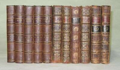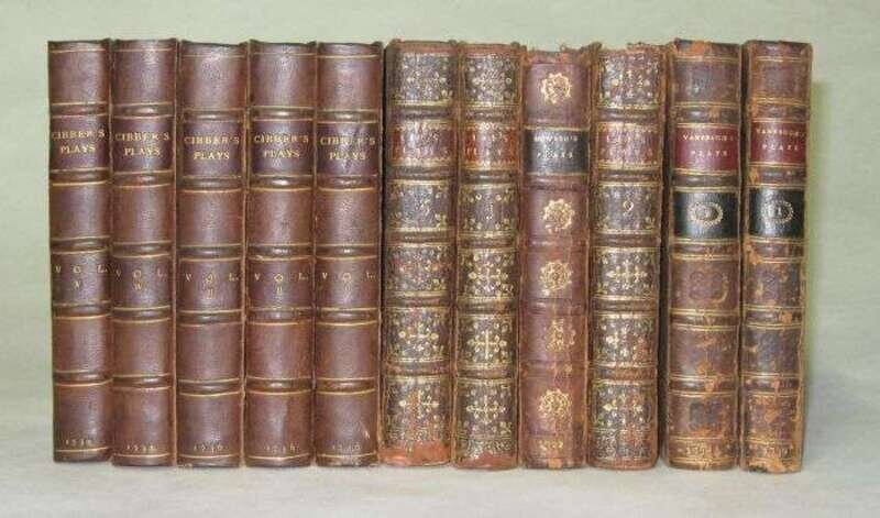 English Drama - 18th-Century Imprints: Cibber, Colley. The Dramatick Works of... London: W. Feales, 1736. 5 vols. 12mo, contemp. gilt-paneled mottled calf; rubbed & blistered, re-backed in 19th-Century morocco with maroon morocco spine labels. With 20 separate title pages & 18 plates. Light to moderate foxing, occasional dampstaining. Titles often moderately foxed. * Howard, Robert. The Dramatic Works of... London: J. Tonson, 1722. 3rd ed. 12mo, contemp. calf, gilt-ornamental spines, black morocco spine labels; scuffed, joints, corners & extremities rubbed. Frontis. portrait. Scattered light foxing, some, mostly marginal, dampstaining. * Lee, Nathanael. The Dramatick Works of... London: for W. Feakes, 1734. 1st collected ed. 3 vols. 12mo, contemp. gilt-paneled calf, richly gilt spine compartments, russet morocco spine labels; scuffed, joints & extremities rubbed. With 18 separate title pages & 18 plates; lacking portrait of Lee?, 1/2 title in vol. 2. Scattered light foxing, occasional minor dampstaining. * Vanbrugh, John. Plays Written by... London: for J. Tonson, [et al.], 1730. 1st collected ed. 2 vols. 12mo, contemp. calf; heavily rubbed, re-backed?, red & black morocco spine labels. Frontis. portrait. Scattered light foxing, title pages browned.