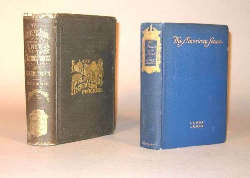 American Literature: (Clemens, S.L.) The Innocents Abroad, or The New Pilgrims' Progress... by Mark Twain. Hartford: American Publishing Company, [etc.], 1869. 1st ed., 3rd issue. 8vo, orig. gilt-lettered & pictorial black cloth; corners bumped, spine ends frayed, other light to moderate wear, hinges stressed. With 2 frontispieces, 14 plates, text illus. Adverts. on pp. (652-656). Minor scattered spotting. BAl 3316. * James, Henry. The American Scene. New York: Harper & Brothers, 1907. 1st ed. 8vo, orig. gilt-lettered blue cloth, spine gilt, t.e.g., other edges untrimmed; corners slightly bumped, spine ends slightly frayed, occasionally slightly scuffed. Internally generally clean. Complete with blanks. BAL 10663 (not assuming priority for the London ed.)