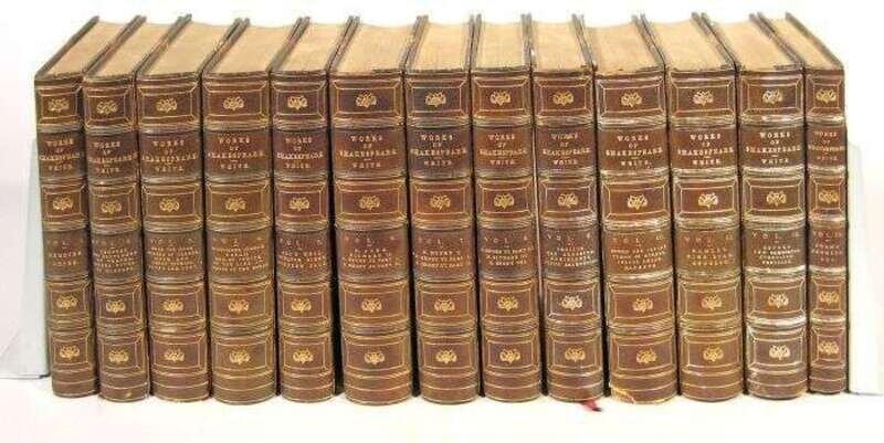 Shakespeare, William. The Works of. Boston: Little Brown and Company, 1866. #19/50. Edited by Richard Grant White. 8vo, contemp. 3/4 green crushed levant morocco & marbled bds., richly gilt lettered, geometrical & floral decorated spine compartments, t.e.g.; spines faded to brown, occasionally scuffed, joints often rubbed & occasionally tender, front cover of vol. 10 detached (but present). Portrait. occasional internal spotting, some light foxing & darkening to front matter.