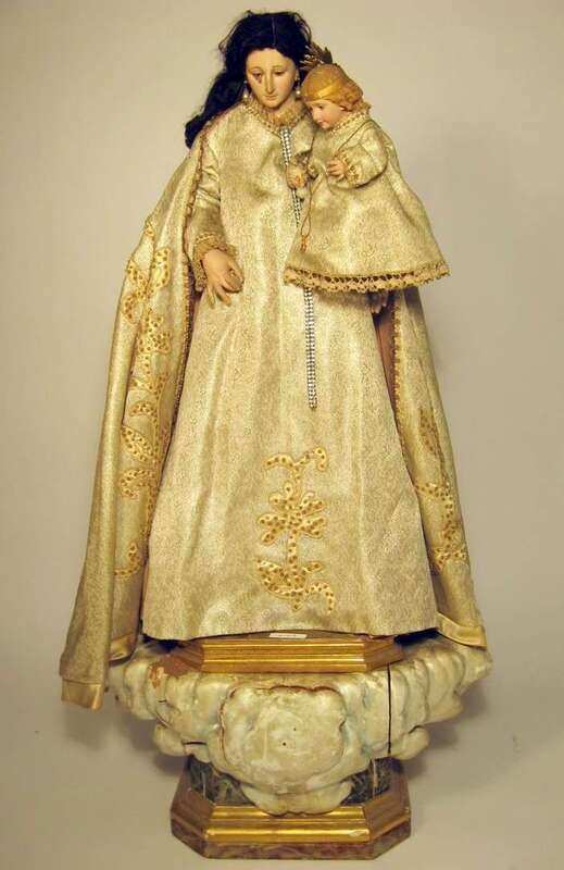 With polychromed composition heads and hands, the Virgin with human hair wig and pearl earrings, both dressed in cream and gold brocade robes, on a carved parcel gilt cloud base.