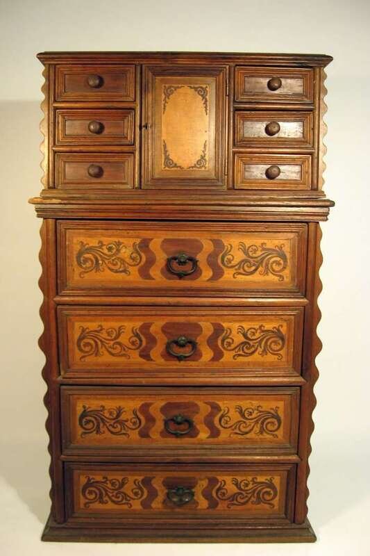 In two parts; the upper section with a central cupboard door flanked by banks of three drawers; the lower section with four foliate inlaid drawers, with wavy molded corners, on a molded base.