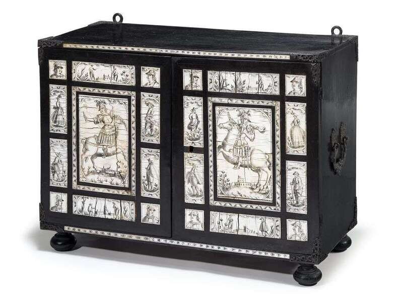 The pair of exterior doors inlaid with ivory panels depicting nobles and equestrian figures, opening to reveal a central door with an ivory panel depicting a classical female and nine small drawers with ivory figural landscape views, raised on bun feet and with metal loop handles.