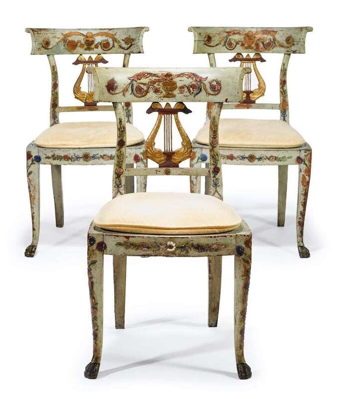 Each with a curved toprail painted with a flower filled urn above a lyre form splat , above a caned seat, raised on straight cabriole legs ending in paw feet. (3).