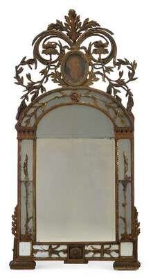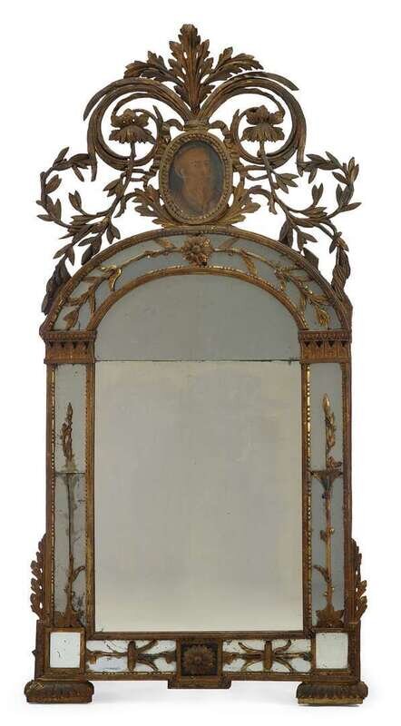 The arched mirror plate in two parts surmounted by floral and foliate scrolls centered by a oval portrait of a man, within a mirrored border applied with giltwood garlands.