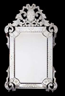 The rectangular mirror plate within a mirrored frame with scroll corners and surmounted by a high pierced foliate scroll crest centered by a ribbon-tied cartouche.