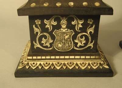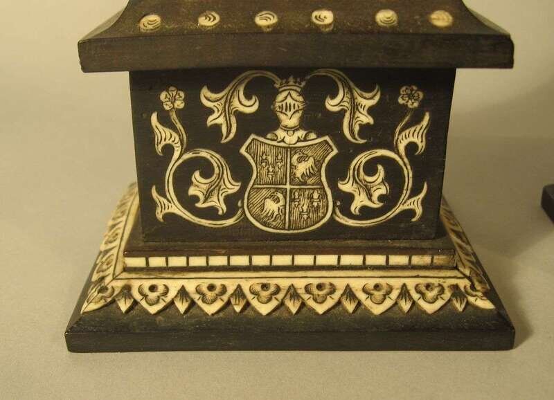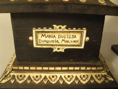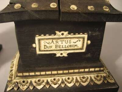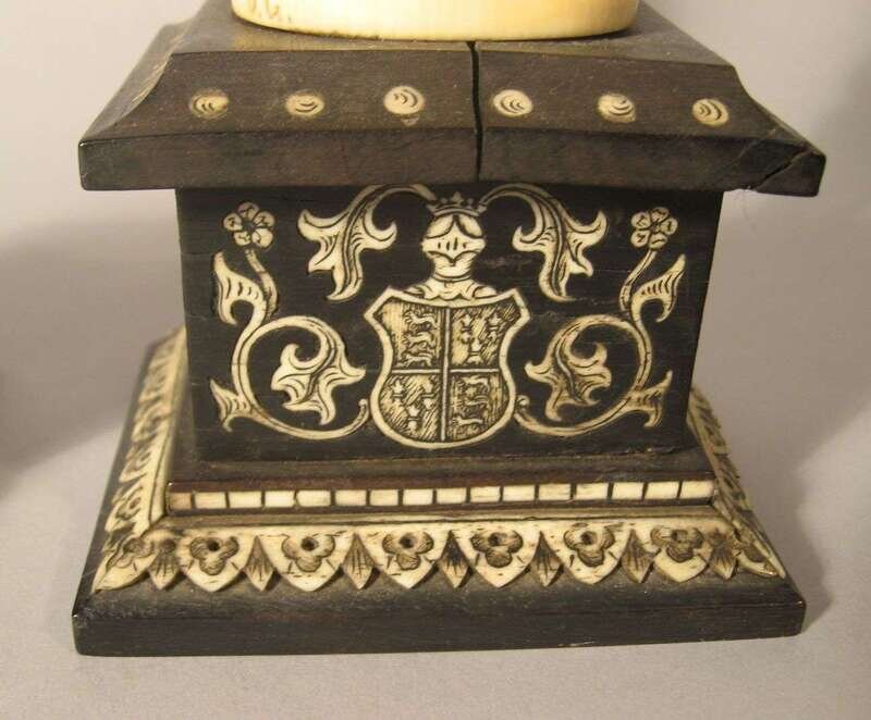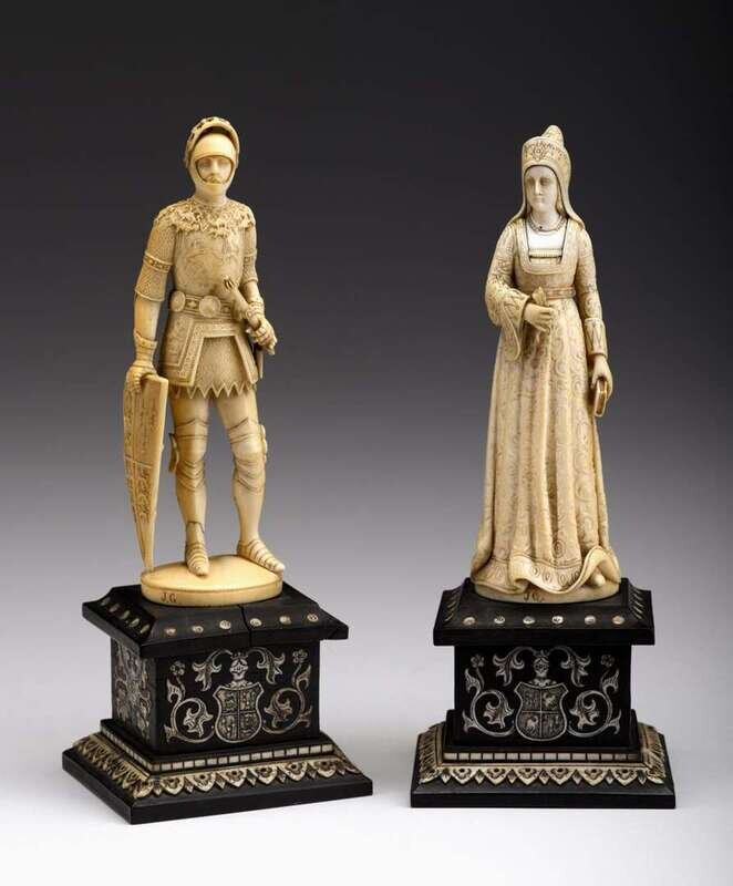 The first depicting Mary of Burgundy, the other example King Arthur, both raised on ivory inlaid ebony pedestal bases and signed with initials 'J.G.' (2).