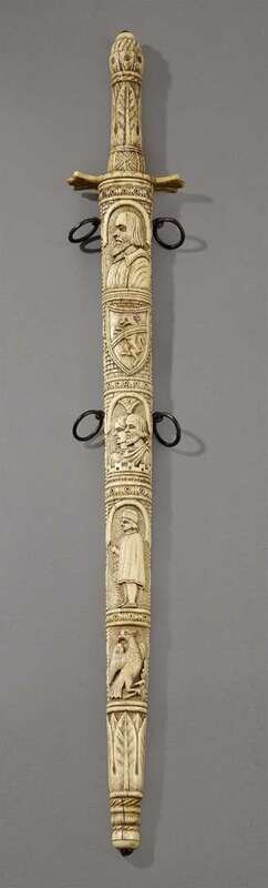 The foliate carved hilt issuing a double edged blade, the scabbard of sectional construction carved with crests and profile portrait medallions, with applied metal hanging rings.