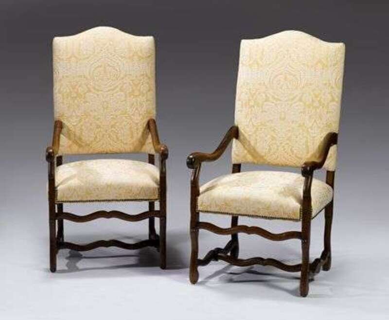 Each with a shaped rectangular padded back leading to scrolled arms, above a padded seat, raised on scrolled legs.
