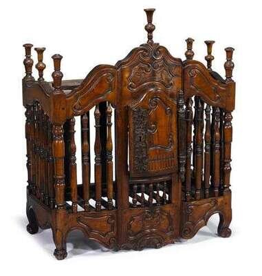 The arched crest rail with turned finials, above a turned spindle lined case with a carved door all above carved scroll feet.