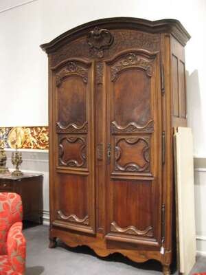 The paneled door surmounted with carved foliate crest flanked by paneled sides, raised on carved heavy block feet.