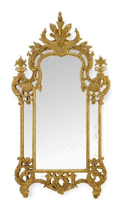The cartouche shaped mirror plate enclosed by smaller mirrorplates surmounted by a plumed crest and flanked by flower filled urns and foliate c-scrolls.
