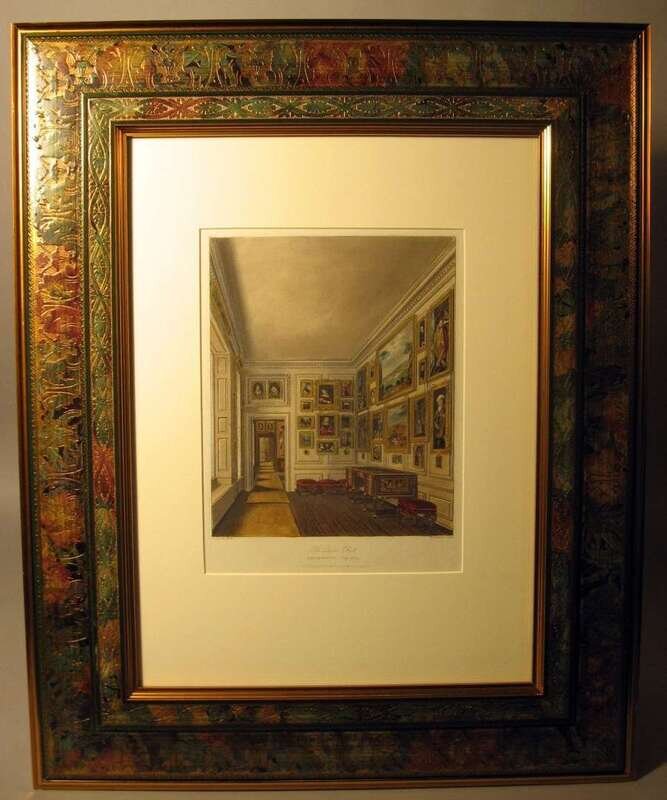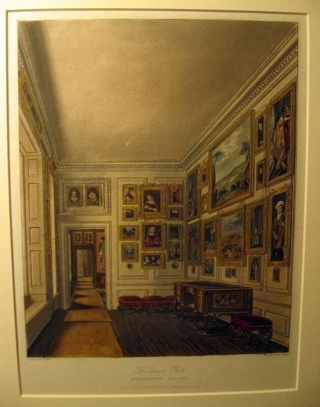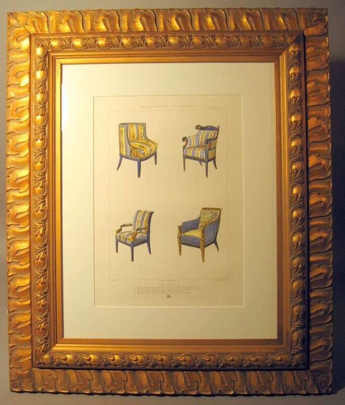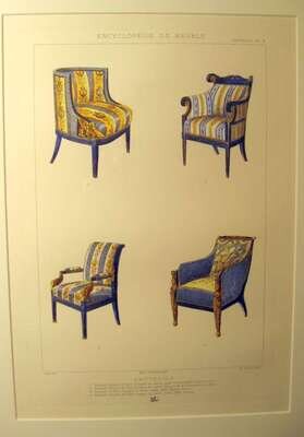 The first depicting the Queen's Closet, Kensington Palace, by W.H Pyne, circa 1817; and a plate from the 'Encyclopedie du Meuble', Fauteuils, plate IV; and framed watercolors of a chaise, duchesse brise and a vitrine.(3).