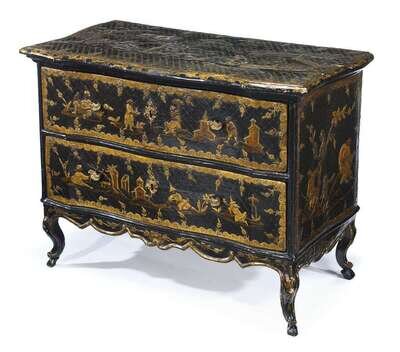 The rectangular shaped and molded top over two long drawers, depicting Chinese figures in landscapes, over a shaped apron and raised on short cabriole legs.