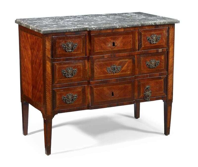 Transitional style kingwood and tulipwood marble top commode late 19th/ early 20th century