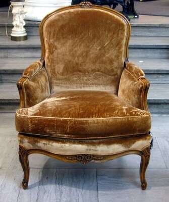 The shaped toprail centered by a carved foliate spray, leading to carved arms, above a padded seat.