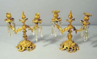 Each with a foliate standard headed by a foliate finial and issuing two scrolling candlearms hung with prism drops , raised on a pierced c-scroll base, stamped 'LG'. (2).