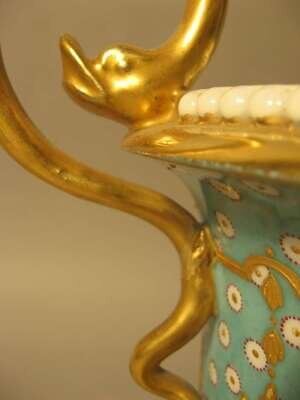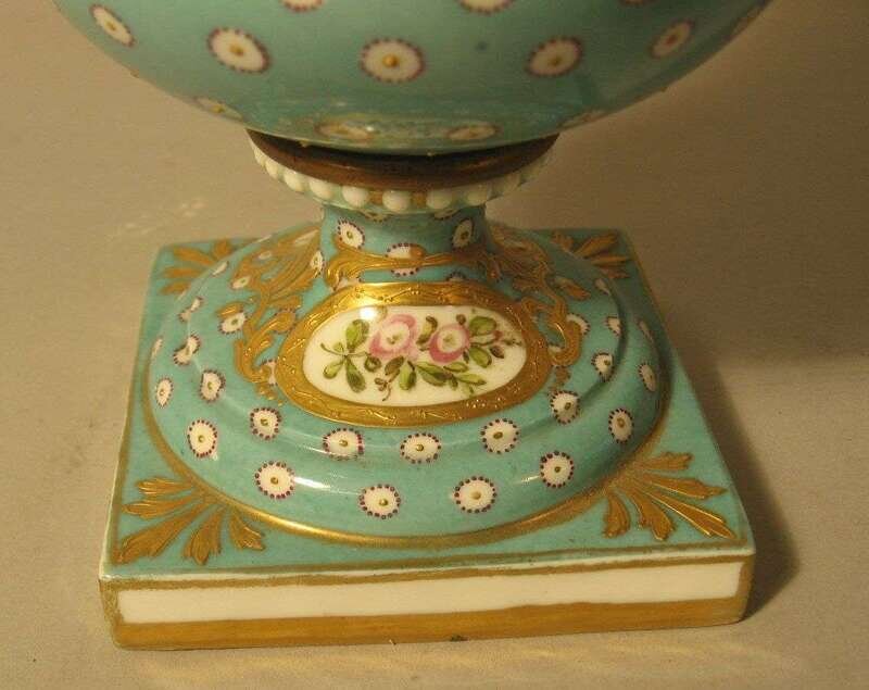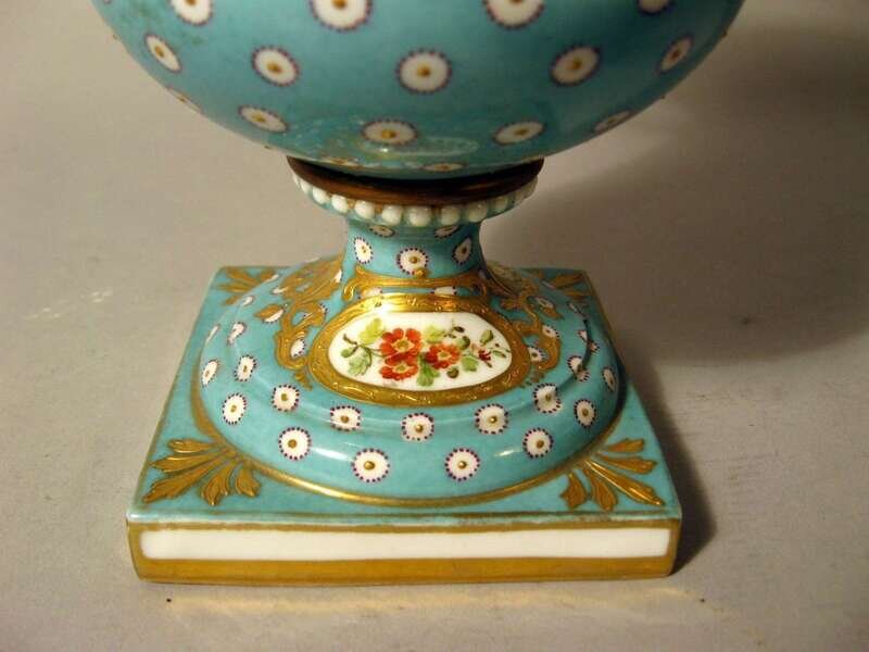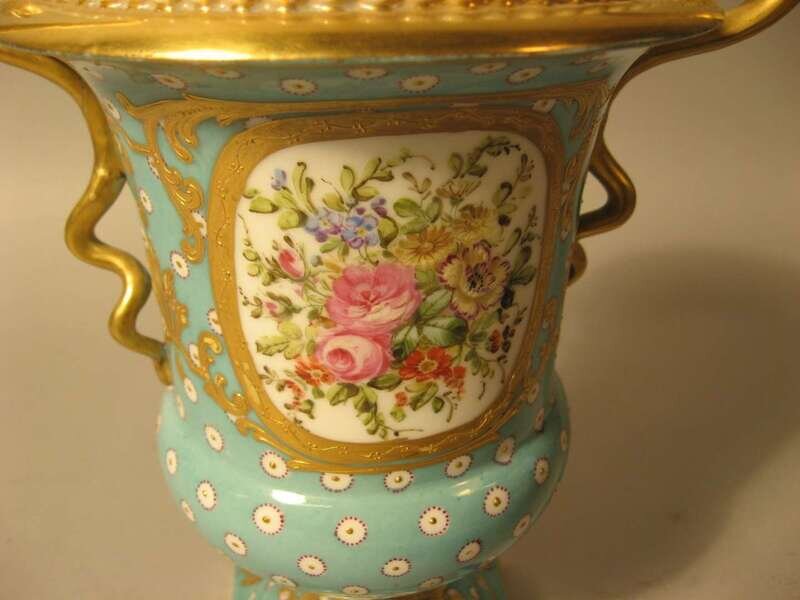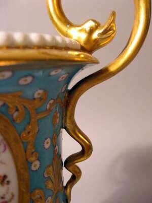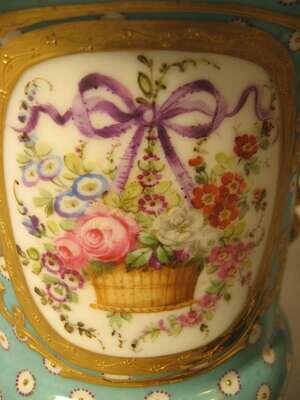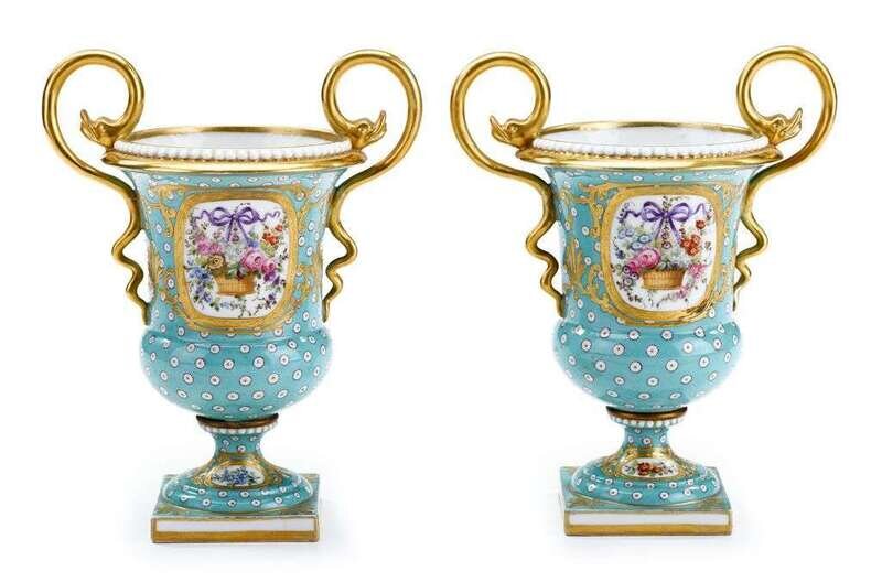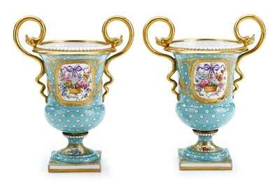 Each of campana form with gilt scroll handles and beaded rims, the bodies with floral bouquet reserves on a patterned bleu celeste ground, on square socle; blue Sevres mark. (2).