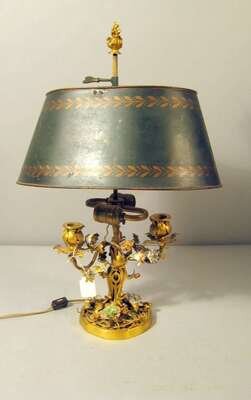 With two foliate scrolling candlearms mounted with flowerheads, upon a pierced circular base and a tole shade; electrified.