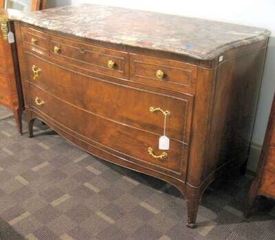 The serpentine marble top over three short and two long molded drawers, raised on short legs with scrolled toes.