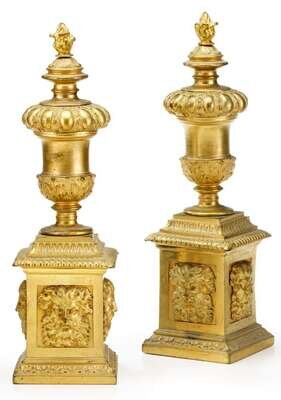 Each with a flame finial above an egg and dart band and urn-form body, raised on an upright pedestal base mounted with bearded masks. (2).