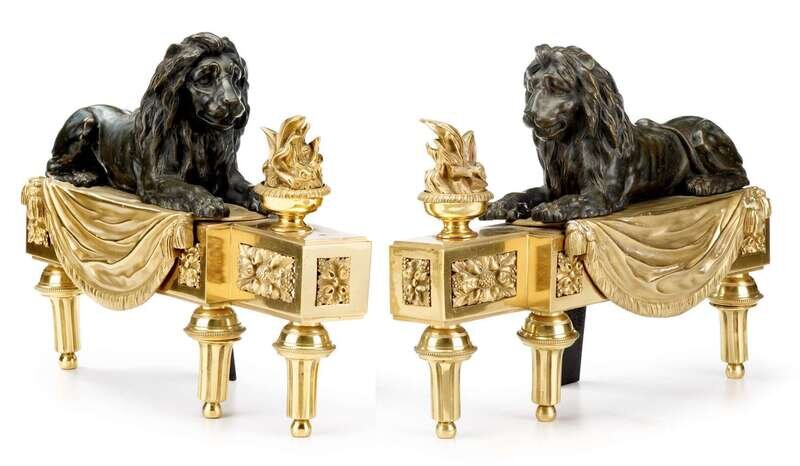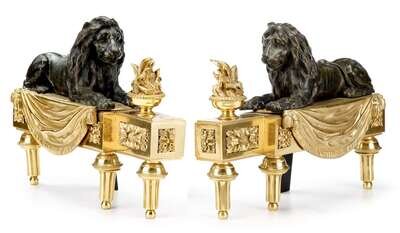 Pair of Louis XVI style gilt and patinated bronze chenets