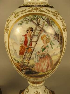 Each of baluster form with oval reserves of young couples in 18th century dress, on a white ground, raised on a square base. (2).
