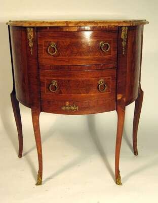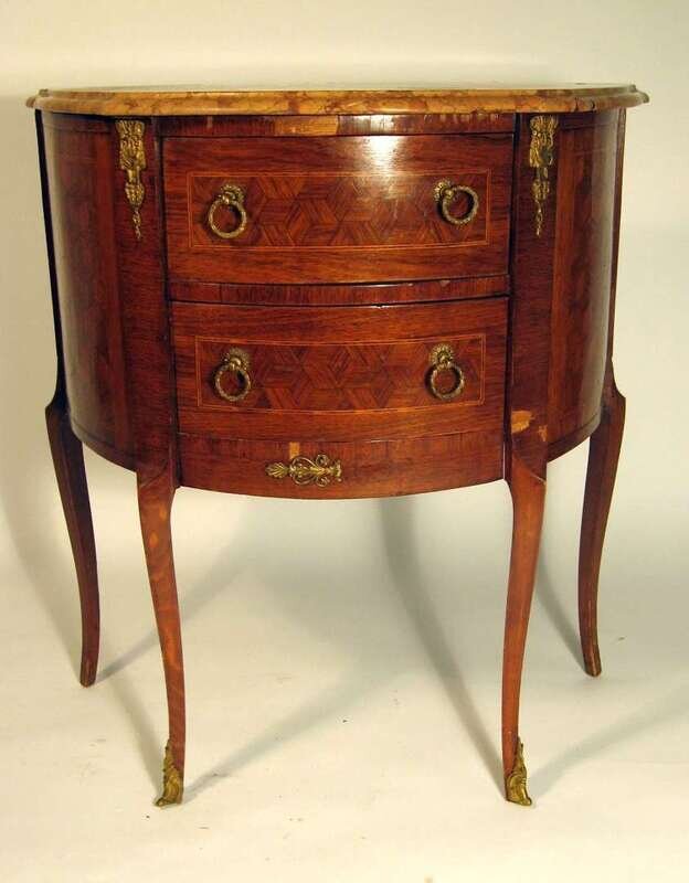 Each with a demilune marble top above two short drawers, with cubic inlay, raised on hipped cabriole legs ending in sabot.