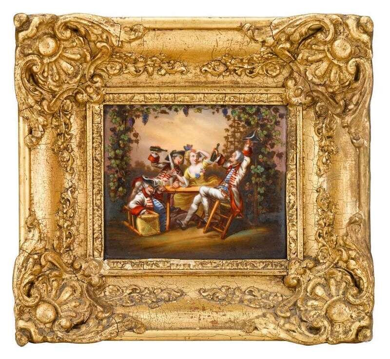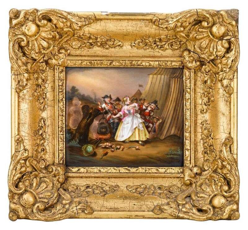 Each painted with a scene depicting a young lady in 18th century dress entertaining soldiers, in giltwood frames. (2).