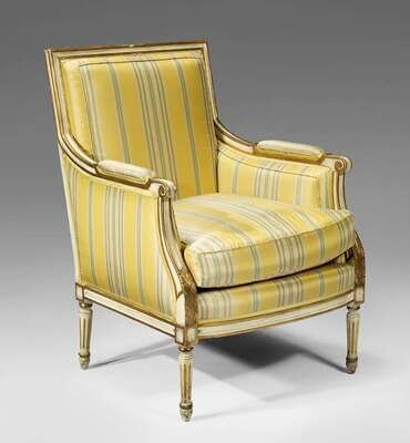 Associated pair of Louis XVI style painted and parcel gilt bergeres