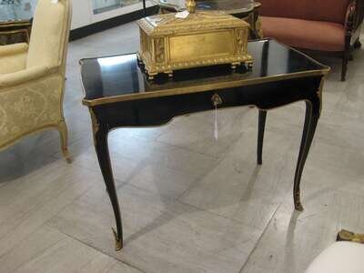 The shaped top outlined in brass, above one short drawer, raised on cabriole legs ending in sabot.