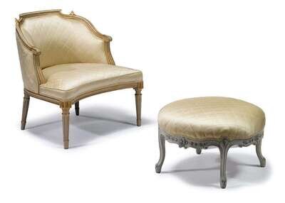 With molded curved foliate carved backrails above curved padded backs and padded seats, raised on fluted tapered round legs headed by paterae; together with a Louis XV style painted tabouret.(3).
