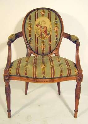The oval padded with needlework upholstery, issuing carved part padded arms,over a padded seat, raised on round tapered forelegs.(2).
