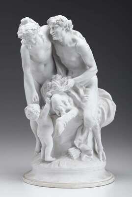 Modeled as a seated satyr attended by a bacchante and child, inscribed 'CLODION'.