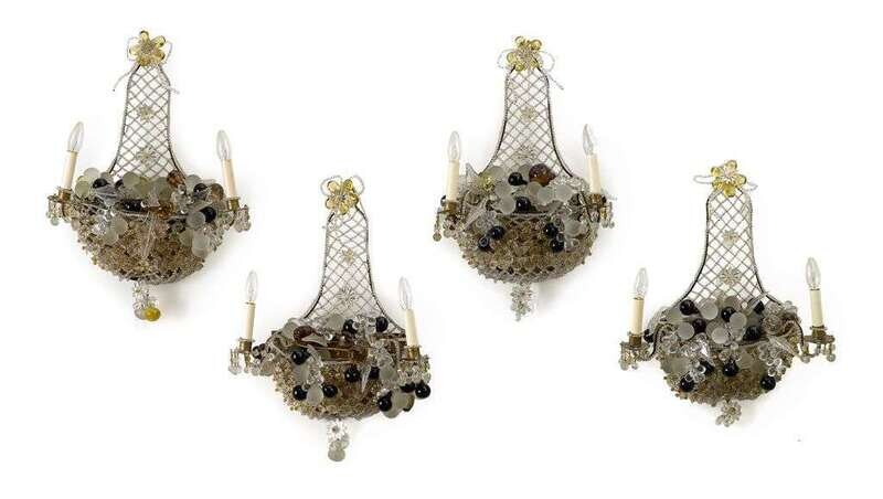 Of basket-form filled with colored and frosted glass fruit , against a ribbon tied glass bead lattice backplate, issuing two scrolled candlearms. (4).