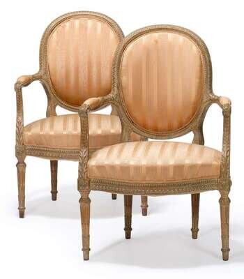The entrelac carved and padded oval backs continuing to part padded and scroll carved arms, over a padded seat raised on paterae headed tapering fluted legs with foliate carved feet. (2).