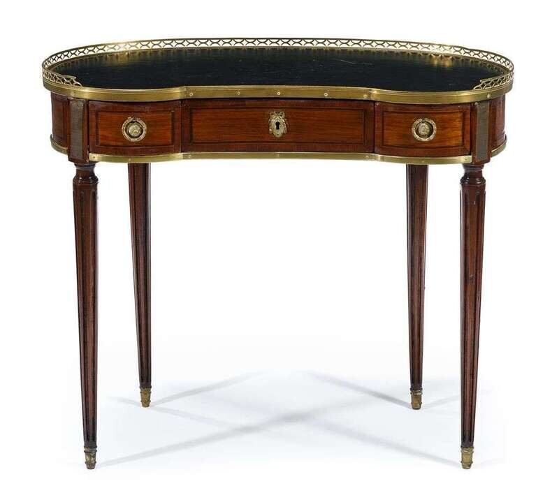 The green leather reniform top with pierced three quarter gallery above three short frieze drawers, raised on fluted tapered round legs ending in caps.