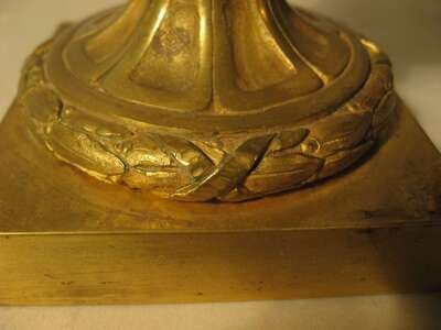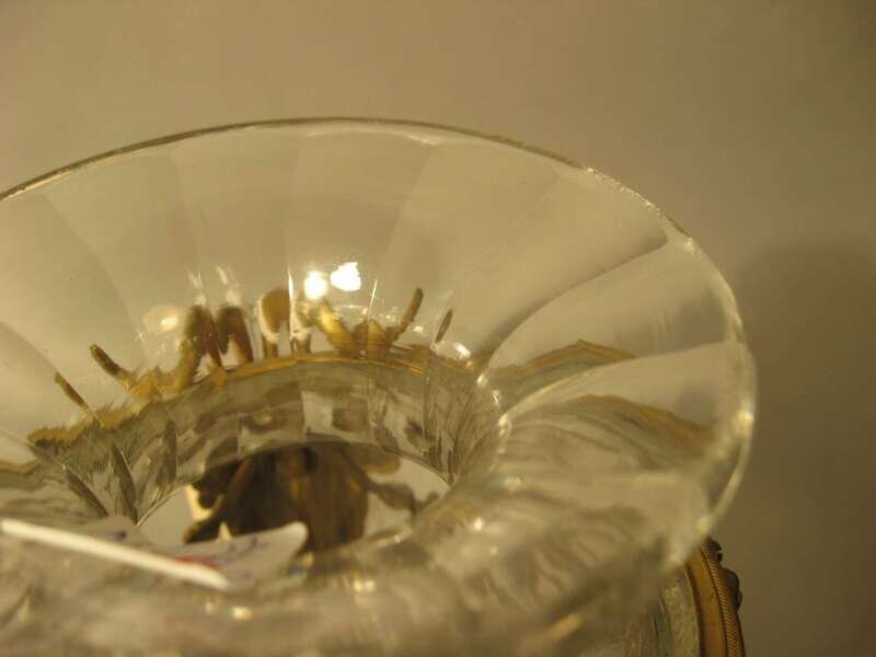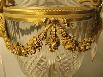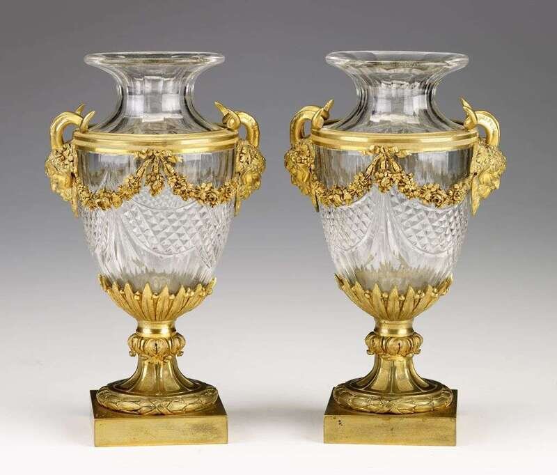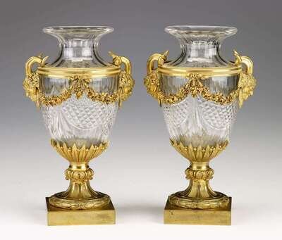 Fine pair of Louis XVI style ormolu mounted glass urns 19th century, the glass probably baccarat