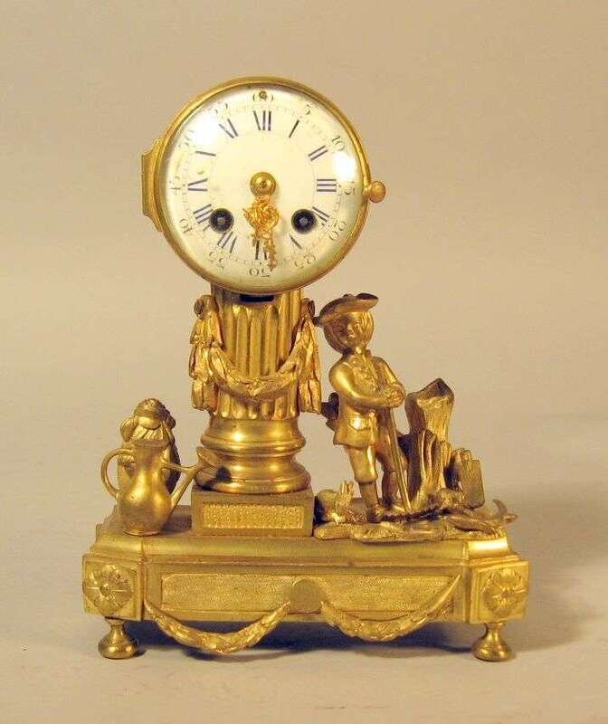 The circular enamel dial with Roman and Arabic numerals set into a drum case on a fluted column flanked by a gardener and his accoutrements, on a shaped rectangular base mounted on bun feet.