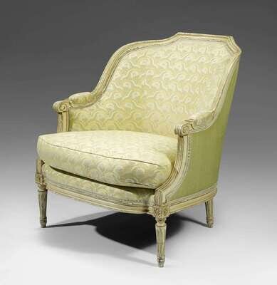 The shaped enclosed back leading to part upholstered and carved arms, above a loose cushion seat, raised on round tapered fluted legs.