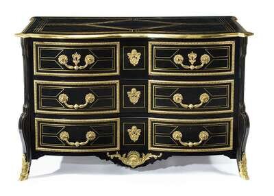 The brass lined shaped top with outset corners above three brass outlined long drawers, raised on short cabriole legs ending in hoof sabots.