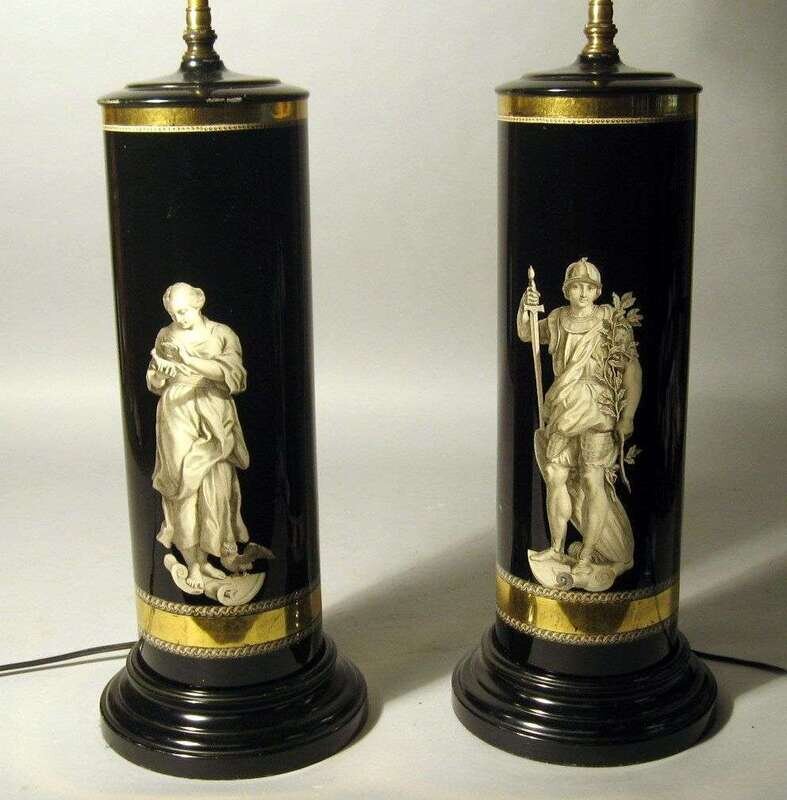Cylindrical, enameled with Classical figures and gilt banding on a black ground; mounted as lamps. (2).