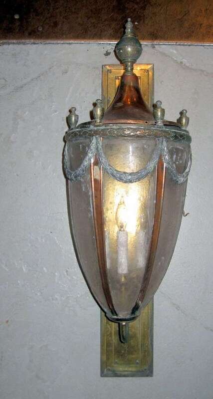 Each with a domed top and finial above a glass case hung with garlands, attached to a rectangular backplate. (2).