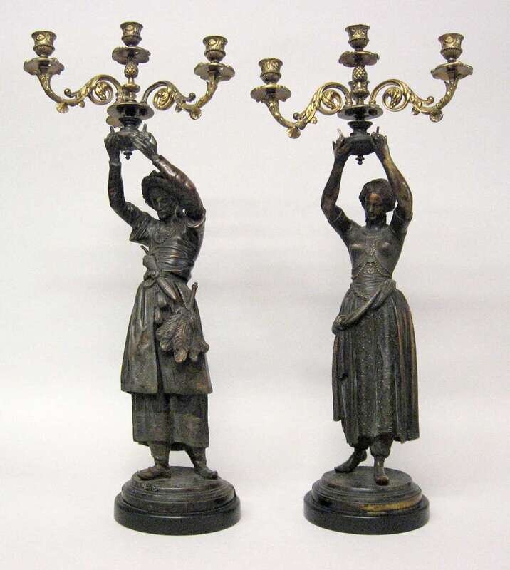 Modeled as a Turkish man and woman, each holding aloft a central and three outscrolling candlearms. (2).