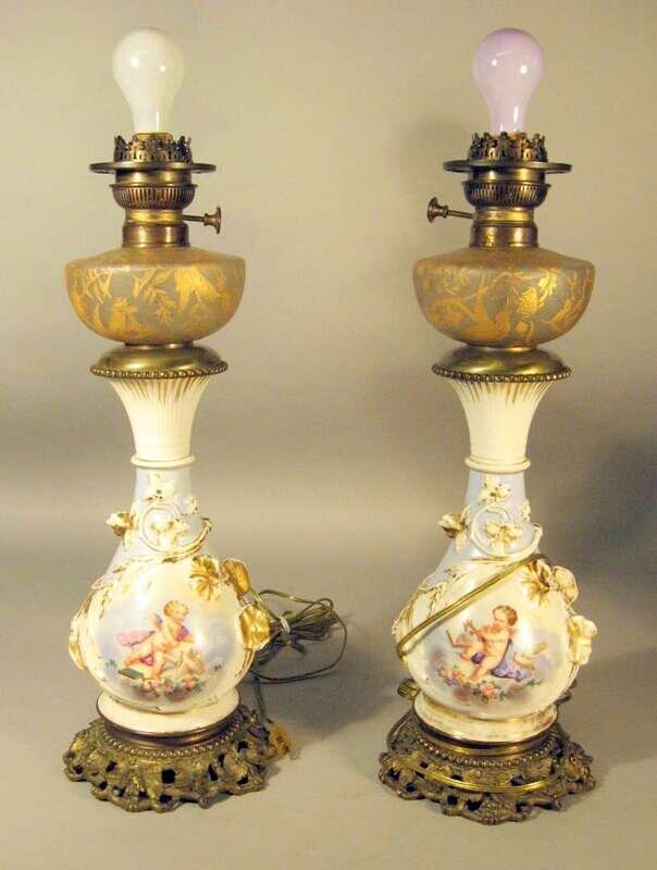 Each of baluster form with raised foliate gilding and painted reserves of putti, on a pierced foliate bronze foot; mounted as lamps. (2).