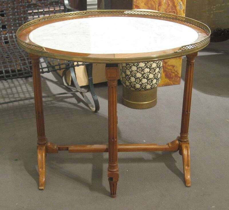 The oval marble top with a brass gallery, raised on an x-form hinged base.