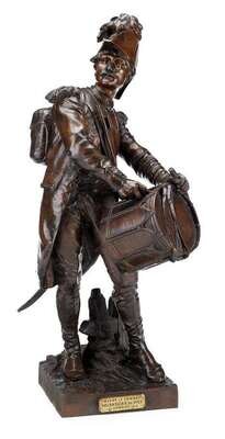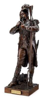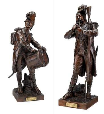 Pair of bronzes, medium brown patina, one modeled lighting his pipe, his rifle resting at his side, the other modeled holding a drum at his side, raised on square bases, inscribed 'H. Dumaige'. (2).