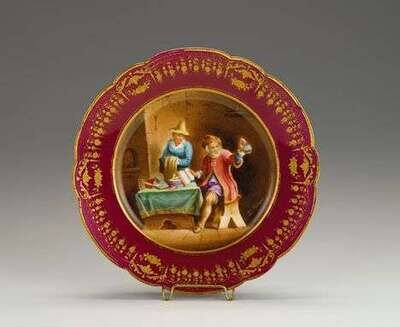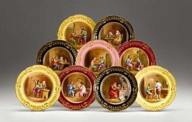 Set of ten Sevres porcelain cabinet plates, after David Teniers late 19th century, retailed by j.e. caldwell