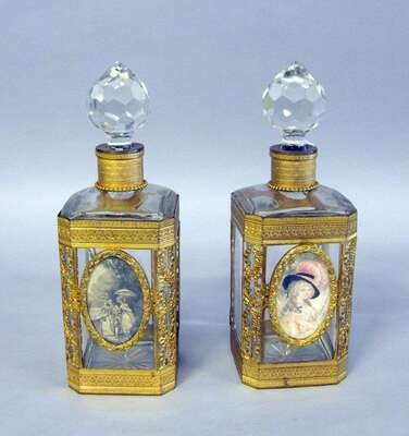 Each with a facetted stopper above an etched gilt metal collar, the upright canted rectangular glass bodies framed in foliate gilt metal mounts and set with oval painted reserves. (2).
